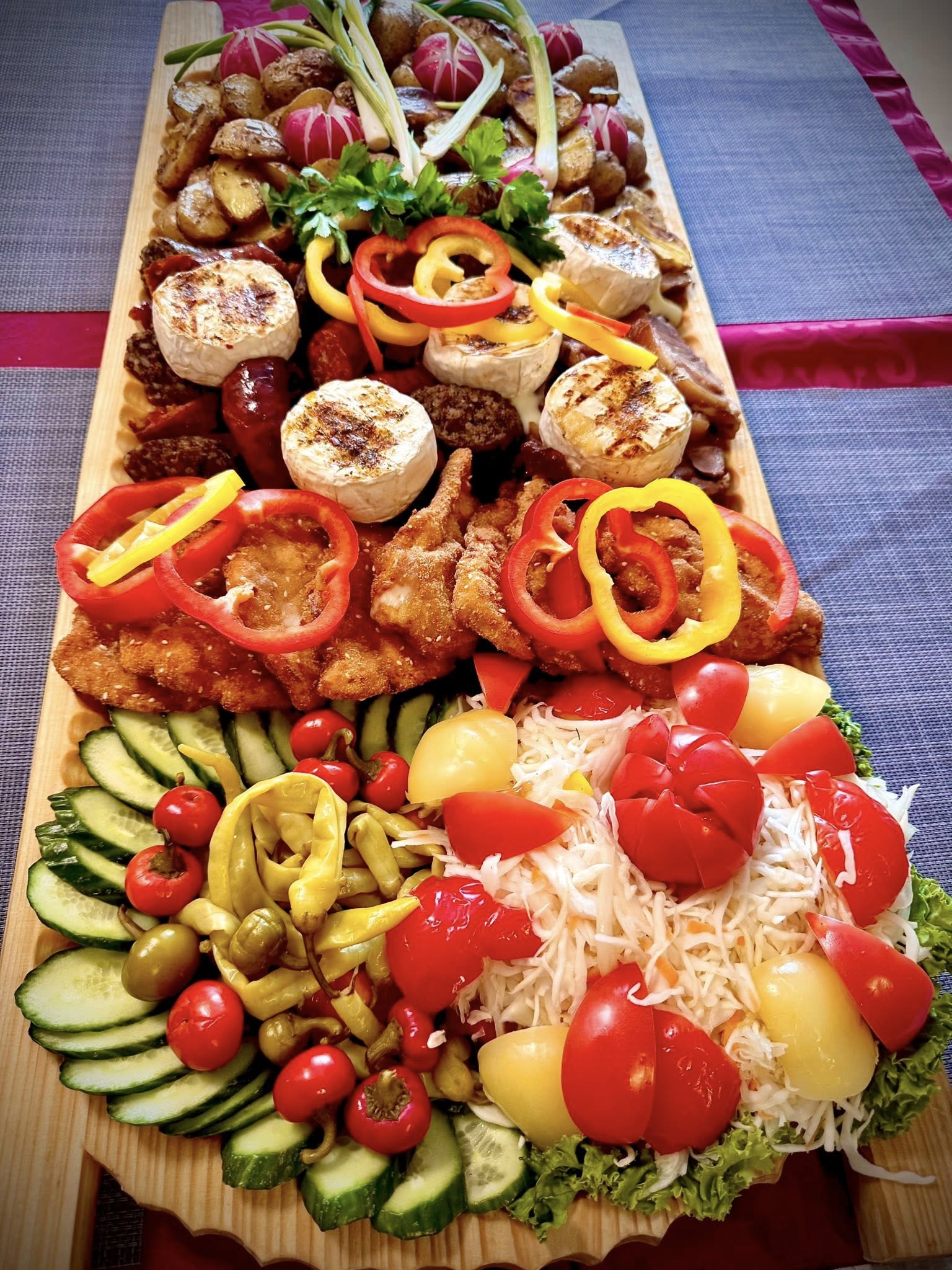Koryto plné pochutín, 4 druhy masa, masové výrobky, syry, zelenina, ryža, opekané zemiaky.